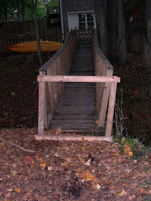 Here's the new bridge gate. Yeah, I realize it's not going to featured on any home improvement shows, but it gets the job done. And it was free - liberated hogwire fastened to lumber from a frat dumpster with some nails.
