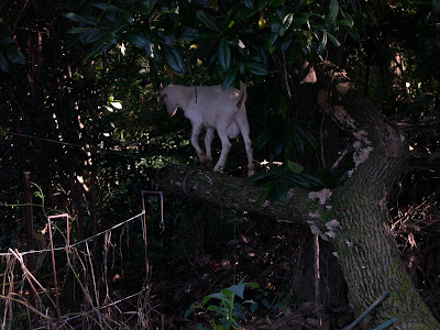 Our three goat eating machine took a break yesterday to provide a little entertainment. This hornless guy has proved himself the best climber, scrambling up the downed tree trunk to munch on some English ivy. He looked pretty nimble up there, even when squeezing around a thick vertical limb.