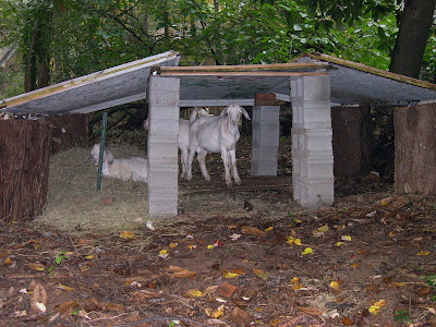 I ran out of daylight/motivation this evening after choosing this particular spot for the new goat shelter's future site. But before throwing in the towel, I rolled four 30" logs into place and relocated the old shelter's cinder blocks. I'll recruit Scott to help out with some grunt work, so it should be hospitable by tomorrow. And look something like this.