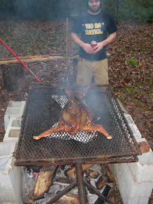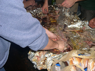 5:45 AM, time to start the late shift for the pig. It's a chore to keep my eyes open and fingers typing, so pardon the brevity. Just come and getcha some pig. Some of the 200 lbs of Cajun-cooked pig that's been spinning over a 3 x 7 foot fire for the past 12 hours. Pictures and details to be posted soon.
