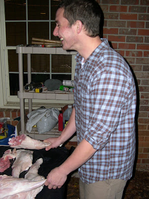I will say, however, that the goats died a very quick, clean death. Instantaneous. Rodney's preferred method is shooting the goats with a .22 rifle (in the head), then hanging and skinning much like you would a deer. If you're interested - and it sounds like several people are - here are a couple of pictures from the afternoon. Be aware there are, in fact, dead goats in the pictures. Any particularly bloody or disturbing pictures were not included, so don't be too hesitant to click. Looks just like your grocery store meat would. The captions are somewhat instructional, you know, just in case 2012 rolls around and you've gotta feed some mouths.