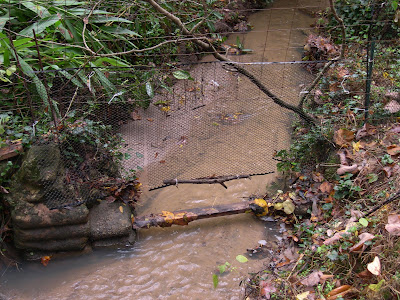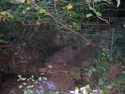 Where high water and debris come rushing down, we made two vertical cuts so that a section can swing downstream and allow the junk to pass under. To keep it weighed down in place and deter goats from testing its strength, we fastened a heavy stick to the bottom. It looks nice, but that doesn't mean squat to a goat. We'll see how long until we have to go chasing again...