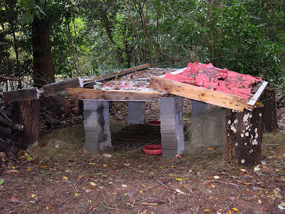 To the immediate right and left of the pictures borders are two huge magnolias. It's obvious that their combined canopies keep the ground relatively dry. And those leaves should last through winter. There'll be a palette under there as well to keep the sleeping quarters above ground.