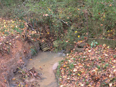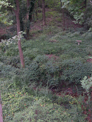 • For one, every piece of foliage is stripped from the stems and branches of the evil English ivy. Take, for example, the downed mulberry on the other side of the creek. It's stump and lower trunk were completely carpeted with English ivy. Once defoliated, the ivy pulled right off the tree. Now, the tree is entirely visible again. Much more visually appealing.