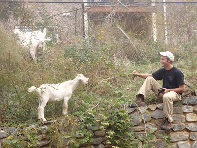 Besides a little tighter squeeze in the makeshift transporter and an unpleasant introduction to fire ants, our four goats peformed wonderfully. While Caroline, Clarence, Thomas, and I felled mimosa trees and gathered trash, the reunited goats spent the afternoon grazing on a smorgasborg of wisteria, dog fennel, and privet. Although a mere 6 hours barely put a dent in the space's overall appearance, the outing definitely serves as proof that goats should be considered as an economical, quiet, and entertaining management solution.