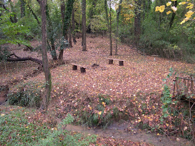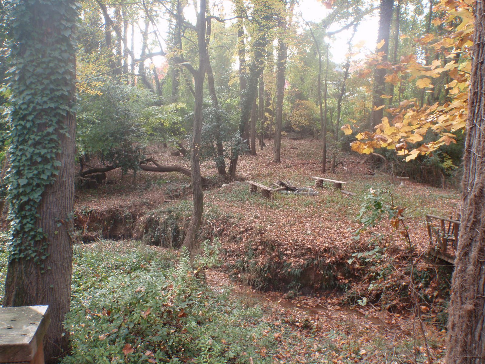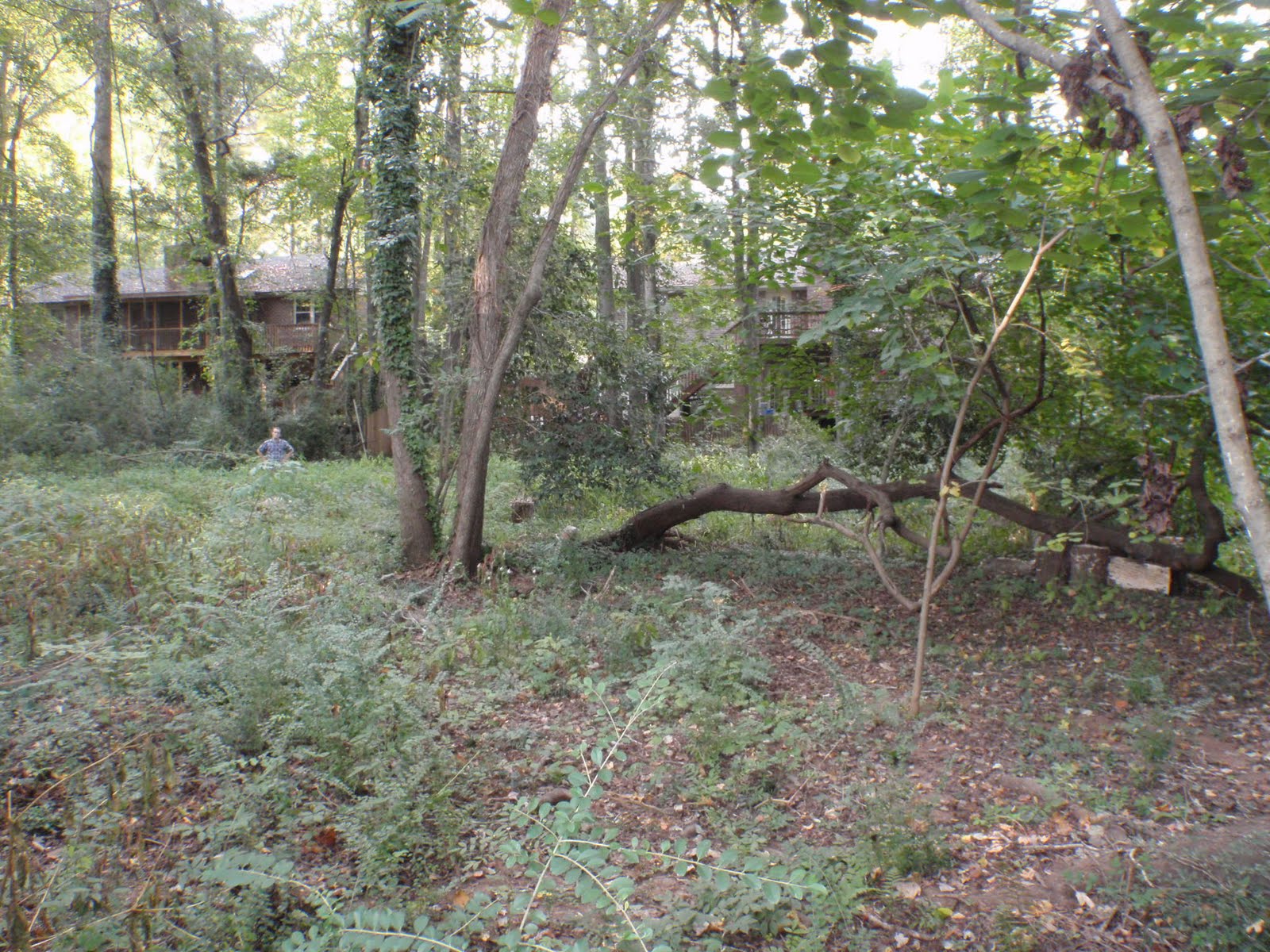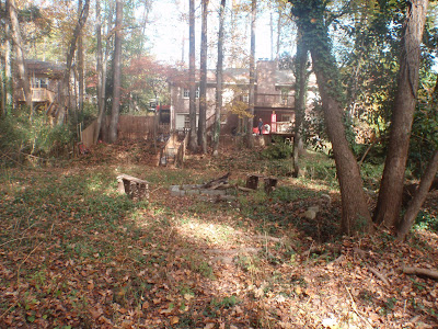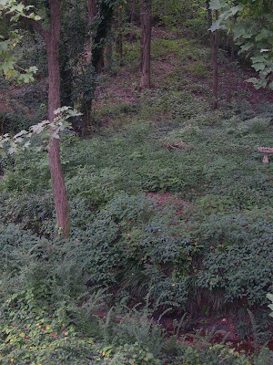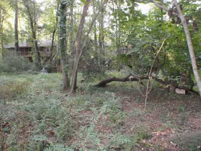 You'll have to use your imagination to compare the pictures below with what was once an opaque mass of privet and honeysuckle. Everything under 4 feet has been stripped bare, improving sight lines back into the yard. Hopefully, the groundlayer of English ivy will be the next course...